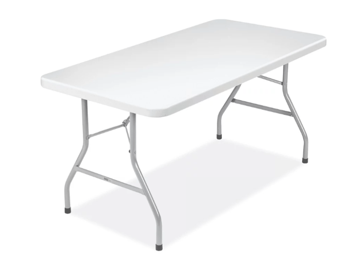 A sturdy 6-foot white folding table built for rental use — lightweight yet durable, it sets up and tears down quickly to serve as a reliable surface for dining, serving stations, registration tables, craft projects, or display needs. The smooth white top wipes clean easily, and the folding steel legs lock into place for stable support; rubber feet help protect floors and reduce slipping. Easy to transport and store when folded, this versatile table adapts to indoor or outdoor events and blends unobtrusively with any décor.